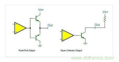 關(guān)于推挽輸出和開漏輸出,最后用一幅最簡單的圖形來概括:該圖中左邊的便是推挽輸出模式,其中比較器輸出高電平時下面的PNP三極管截止,而上面NPN三極管導(dǎo)通,輸出電平VS+;當(dāng)比較器輸出低電平時則恰恰相反,PNP三極管導(dǎo)通,輸出和地相連,為低電平。右邊的則可以理解為開漏輸出形式,需要接上拉。