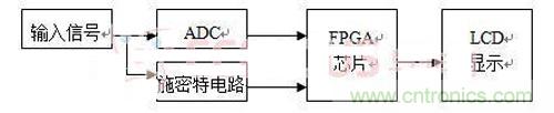 將輸入的模擬信號分成2路,一路經(jīng)ADC輸入FPGA 芯片 ,另一路經(jīng)斯密特電路輸入給FPGA 。FPGA外接20MHz的晶振,通過FPGA 內(nèi)部的鎖相環(huán)倍頻至200MHz,即周期為5ns的方波信號。用此方波信號作為時間基準(zhǔn),對經(jīng)斯密特電路輸入信號的周期進(jìn)行測量,得到被測信號周期=N*5ns,則等效采樣的時間間隔=m*(N*5ns)+5ns。根據(jù)等效采樣原理,此時的采樣率相當(dāng)于1/5ns=200MHz,利用LCD顯示技術(shù),可以看到此效果。
