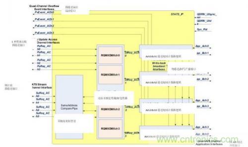 圖2中的STATS_IP架構(gòu)模塊圖標(biāo)出了三個(gè)子部件:每條通道的同地址比較管道(SACOMP)區(qū)塊、請(qǐng)求-復(fù)用-解復(fù)用(REQ_MXDMX_CHn)區(qū)塊以及每條QDR IV應(yīng)用通道1個(gè)的4個(gè)A-B通道配對(duì)計(jì)數(shù)器邏輯(ABCH_CTRL_CHn)區(qū)塊實(shí)例。