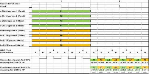 統(tǒng)計(jì)流四通道和一秒(處理器)更新四通道接口作為應(yīng)用通道。QDR IV控制器采用帶有為QDR IV端口A和端口B定義的專用四通道端口界面的4:1/1:4通道復(fù)用/解復(fù)用功能。QDR-IV控制器以固定順序?qū)νǖ肋M(jìn)行復(fù)用和解復(fù)用,應(yīng)用端和以4X時(shí)鐘頻率運(yùn)行的QDR IV設(shè)備端之間的順序?yàn)閏h0、ch1、ch2和ch3。圖3為所假設(shè)的QDR-IV控制器順序和建議的QDR IV HP統(tǒng)計(jì)計(jì)數(shù)器解決方案和QDR IV XP統(tǒng)計(jì)計(jì)數(shù)器解決方案應(yīng)用通道映射。