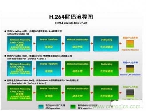 通過(guò)具有H.264硬件解碼引擎的顯卡,就可以完成H.264編碼的全部4個(gè)處理步驟(圖解第三行),也就是實(shí)現(xiàn)全程解碼,這就是它們能讓H.264高清視頻播放的CPU占用率大幅度下降的根本原因。既然顯卡完成了所有的高清解碼處理,那么CPU自然就空閑了。而我們所謂的部分解碼,就是CPU仍然承擔(dān)一定的處理任務(wù),因此占用率仍然要高出不少。