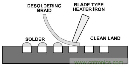 去錫。利用吸錫線和刀片型烙鐵去除焊盤(pán)上過(guò)多的焊料(參見(jiàn)圖6)。所選刀片的寬度應(yīng)與器件占用的最大寬度相匹配。刀片溫度必須足夠低,以避免損壞電路板。可將焊劑涂在焊盤(pán)上,然后用吸錫線和烙鐵去除過(guò)多焊料。