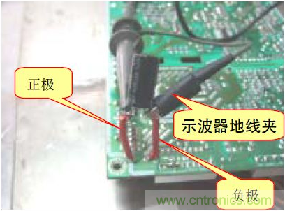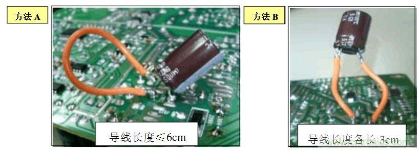 B. 方法(2):在電源板的錫面找出待測電容正負(fù)極對應(yīng)的焊點(diǎn),焊上兩根導(dǎo)線,然后用電壓探頭夾住引出的導(dǎo)線測試.如下圖: