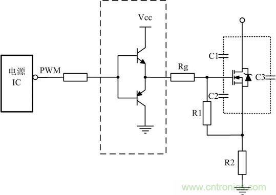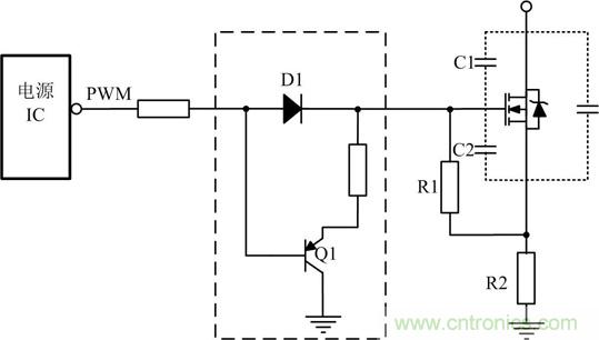 如果選擇MOS管寄生電容比較大,電源IC內(nèi)部的驅(qū)動(dòng)能力又不足時(shí),需要在驅(qū)動(dòng)電路上增強(qiáng)驅(qū)動(dòng)能力,常使用圖騰柱電路增加電源IC驅(qū)動(dòng)能力,其電路如圖 2虛線(xiàn)框所示。