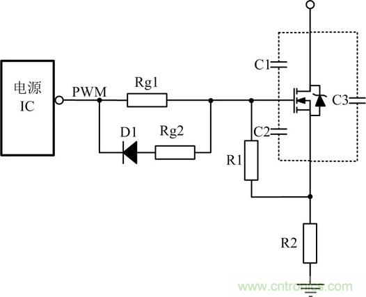 關(guān)斷瞬間驅(qū)動(dòng)電路能提供一個(gè)盡可能低阻抗的通路供MOSFET柵源極間電容電壓快速泄放,保證開(kāi)關(guān)管能快速關(guān)斷。為使柵源極間電容電壓的快速泄放,常在驅(qū)動(dòng)電阻上并聯(lián)一個(gè)電阻和一個(gè)二極管,如圖3所示,其中D1常用的是快恢復(fù)二極管。這使關(guān)斷時(shí)間減小,同時(shí)減小關(guān)斷時(shí)的損耗。Rg2是防止關(guān)斷的時(shí)電流過(guò)大,把電源IC給燒掉。