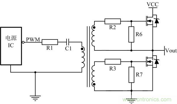 為了滿(mǎn)足如圖5所示高端MOS管的驅(qū)動(dòng),經(jīng)常會(huì)采用變壓器驅(qū)動(dòng),有時(shí)為了滿(mǎn)足安全隔離也使用變壓器驅(qū)動(dòng)。其中R1目的是抑制PCB板上寄生的電感與C1形成LC振蕩,C1的目的是隔開(kāi)直流,通過(guò)交流,同時(shí)也能防止磁芯飽和。