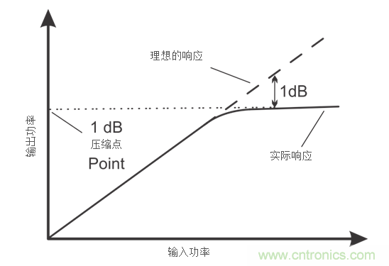 第二種規(guī)格,輸出1dB壓縮點(diǎn),實(shí)際上非常類似于最大線性輸出電壓和電流的概念。它也被稱為P1dB,在該點(diǎn)上,放大器從理想狀態(tài)下增益壓縮到1分貝的輸出功率級(jí)。圖1介紹了該概念,其中,實(shí)線表示測(cè)得的信號(hào),虛線表示理想的信號(hào)。有時(shí),一些測(cè)量將P1dB點(diǎn)與輸入而非輸出對(duì)照,這應(yīng)在計(jì)算中予以考慮。