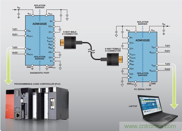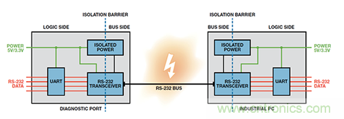 要提供隔離式 RS-232 通信接口,兩端的器件必須與所連的RS-232 電纜相互隔離。要隔離數(shù)據(jù)鏈路,則必須對(duì)數(shù)據(jù)信號(hào)線路和用于驅(qū)動(dòng)該電纜的電源進(jìn)行隔離。來(lái)自診斷端口上UART 的數(shù)據(jù)需要跨越隔離柵并傳輸至隔離總線側(cè)上的RS-232 收發(fā)器。本地 5 V/3.3 V 電源也需要跨越隔離柵來(lái)為隔離總線側(cè)上的 RS-232 收發(fā)器供電。工業(yè) PC 端也同樣需要如此:數(shù)據(jù)和電源均需要跨越隔離柵(圖 3).通過(guò)將器件與 RS-232 電纜網(wǎng)絡(luò)隔離開(kāi)來(lái),診斷端口和工業(yè) PC電路均受到保護(hù),不受惡劣環(huán)境下可能耦合到 RS-232 電纜上的瞬變影響。隔離還可以中斷因診斷端口和工業(yè) PC 端存在不同接地電位而可能出現(xiàn)的接地環(huán)路。RS-232 總線上可能出現(xiàn)的高共模電壓不能跨越隔離柵,從而保護(hù)隔離數(shù)據(jù)的用戶。