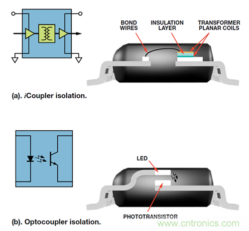 圖 4 比較了兩種主要隔離技術(shù)。iCoupler 技術(shù)(圖 4(a))利用厚膜工藝技術(shù)構(gòu)建可實(shí)現(xiàn) 2.5 kV 隔離的微型片上變壓器,從而在 RS-232 系統(tǒng)中提供信號(hào)隔離。較古老但廣泛采用的光耦合器解決方案(圖 4(b))則采用發(fā)光二極管(LED)和光電二極管。LED 用于將電信號(hào)轉(zhuǎn)換為光,光電檢測(cè)器則用于將光轉(zhuǎn)換回為電信號(hào)。電光轉(zhuǎn)換本身的低轉(zhuǎn)換效率導(dǎo)致功耗相對(duì)較高;光電檢測(cè)器的慢速響應(yīng)則限制其速度;而老化問(wèn)題會(huì)限制其使用壽命。