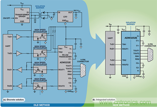 圖 5. 隔離式 RS-232 設(shè)計(jì)比較