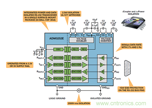 ADM3252E即是這樣的一個(gè)例子,它是一個(gè)緊湊器件中的隔離式雙通道RS-232 收發(fā)器。iCoupler隔離技術(shù)至少在以下五個(gè)方面克服了舊式光耦合器解決方案所造成的限制:集成(由于iCoupler支持雙向操作,因此可縮小總體尺寸并降低系統(tǒng)成本)、性能更高、功耗更低、易于使用且可靠性更高。