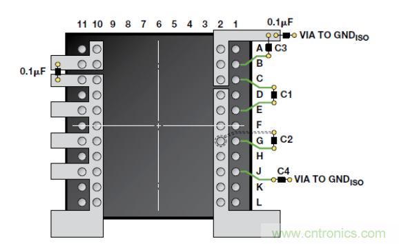 隔離收發(fā)器的PCB布局對(duì)于確保在實(shí)際設(shè)計(jì)中實(shí)現(xiàn)2.5 kV的額定隔離性能至關(guān)重要。主要考慮因素是邏輯端GND和總線端GND之間的爬電距離(沿殼體最短距離)和電氣間隙(最短空氣距離)。ADM3252E的邏輯接口不需要外部電路。輸入和輸出供電引腳需要電源旁路(圖 7)。欲了解有關(guān)PCB布局指南和輻射(EMI)控制結(jié)構(gòu)的更多信息,請(qǐng)參考AN-0971 應(yīng)用筆記“isoPower器件的輻射控制建議”。