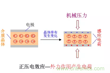 對具有壓電特性的介質(zhì)材料施加機(jī)械壓力,介質(zhì)晶體會(huì)發(fā)生結(jié)構(gòu)重組排布,材料表面會(huì)感應(yīng)出電荷,產(chǎn)生電位差。