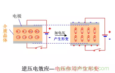 對具有壓電特性的介質(zhì)材料施加電壓,則產(chǎn)生機(jī)械應(yīng)力,發(fā)生形變。