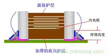 由于保護(hù)層厚度部分是沒有內(nèi)電極的,這部分的BaTiO3陶瓷不會(huì)發(fā)生形變,當(dāng)兩端的焊錫高度不超過底保護(hù)層厚度,這時(shí)產(chǎn)生的形變對PCB影響要小,有效地降低噪聲。