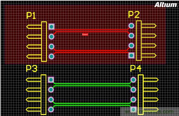 很明顯,2組同樣連線同樣間距的差分對(duì),在Room里的對(duì)象沒有報(bào)錯(cuò),使用新建Room設(shè)置的規(guī)則。而Room外的對(duì)象依然是報(bào)錯(cuò)狀態(tài)。這就是Room為不同區(qū)域設(shè)置規(guī)則的效果。