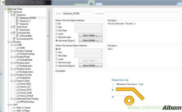 在Room里框選出一定區(qū)域后,不僅僅是可以單獨(dú)設(shè)置線寬規(guī)則,還可以對(duì)它設(shè)置PCB Rule規(guī)則定義頁(yè)面上的任意規(guī)則。