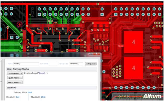 在PCB規(guī)則定義中,比如要對(duì)一塊特定的區(qū)域采用不同的規(guī)則,那么Room是解決這類問題的首選。首先用Room框出這一塊特定區(qū)域并命名為Room1。然后在規(guī)則定義里選擇WithinRoom(''Room1'') ,之后可以為這個(gè)Room里的對(duì)象設(shè)置各種規(guī)則。比如下圖所示,線寬規(guī)則全部違反了最小線寬設(shè)定值,所以都有綠色高亮顯示。然后為右邊的區(qū)域框選了Room1,分別為其設(shè)置了較寬的線寬值10mil,那么Room里的線寬符合規(guī)則定義,已經(jīng)顯示正常,沒有綠色高亮違規(guī)顯示了。但同一根網(wǎng)絡(luò)的