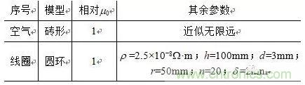 以XOY平面為圓平面,Z軸為高度建立線圈圓環(huán)模型,空氣模型為磚形,如圖1所示。通過布爾操作中的over運算將空氣介質(zhì)與線圈澆筑在一起。材料屬性和模型參數(shù)設置見表1。