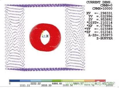 線圈作為載流塊導體,模型是柱形,所以加載電流時需加載環(huán)形電流。切換當前坐標系為柱坐標系,將環(huán)形電流加載在有限元單元上,電流方向水平向右。線圈單元采用電磁場分析操作選項,源電流密度可以直接加在有限元單元上,如圖3所示。