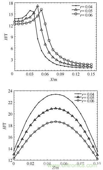 1)線圈產(chǎn)生的磁場強度在徑向上由線圈半徑附近向兩端衰減,縱向上線圈上下兩端處磁場強度有最大值。