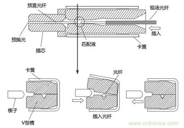光纖快速連接器/冷接子可分為預置光纖和非預置光纖兩大類。預置光纖快速連接器/冷接子的接續(xù)點在連接器內部,并預置有匹配液;非預置光纖快速連接器/冷接子的接續(xù)點在連接器表面,不預置匹配液,直接通過適配器與目標光纖對接。非預置光纖快速連接器/冷接子的工作原理很簡單,這里不做贅述。下面詳細說明預置光纖快速連接器/冷接子的原理:如下圖所示,預置光纖膠接在插芯中,接續(xù)點設在放有折射率近似纖芯的導光材料-匹配液的V型槽中,從而實現預置光纖和目標光纖的無縫貼合。
