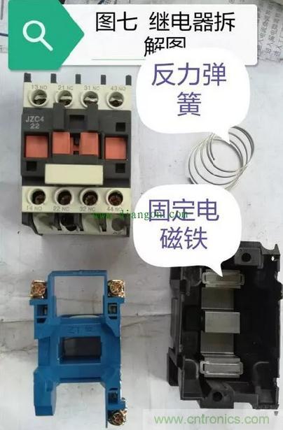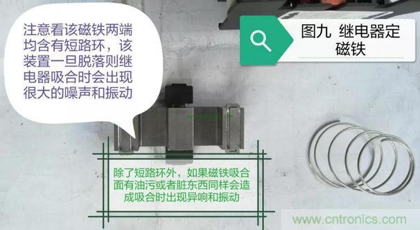 接下來我們再來看一下繼電器內部吸合部分的構造,在這部分當中以固定吸合磁鐵上短路環(huán)所引發(fā)的故障最為常見,詳情請看圖七至圖九的展示: