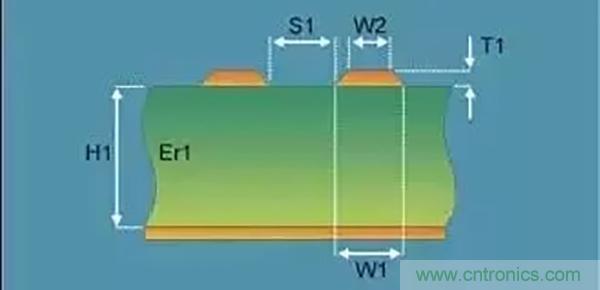 因?yàn)椴罘肿杩褂绊懖罘中盘柕难蹐D、信號帶寬、信號抖動和信號線上的干擾電壓。差分線阻抗一般控制在90(±10%)歐姆(具體值參照芯片手冊指導(dǎo)),差分線阻抗與線寬W1、W2、T1成反比,與介電常數(shù)Er1成反比,與線間距S1成正比,與參考層的距離H1正比,如下圖是差分線的截面圖。