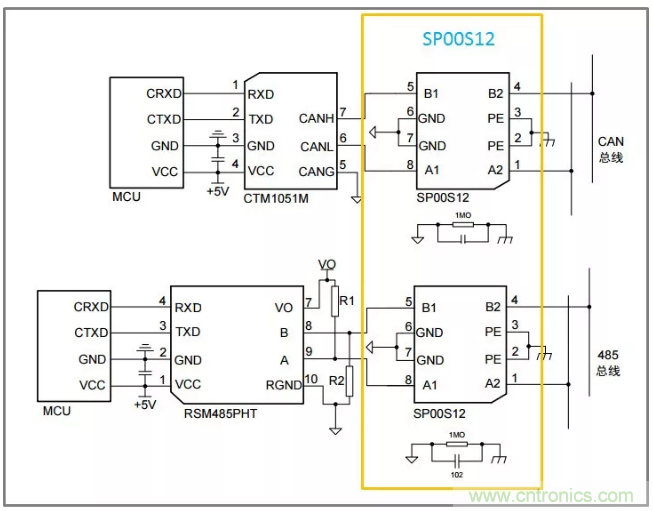 另一種方案則是采用ZLG的SP00S12浪涌保護(hù)模塊,可用于各種信號傳輸系統(tǒng),抑制雷擊、浪涌、過壓等有害信號,對設(shè)備信號端口進(jìn)行保護(hù)。搭配ZLG的全隔離CTM或SC系列的隔離CAN收發(fā)器,如下圖??蓸O大程度的提升產(chǎn)品的集成度,于此同時極大程度的縮小開發(fā)周期。