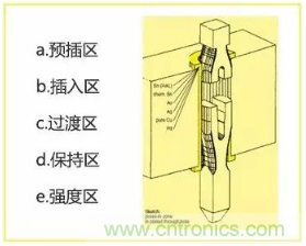 業(yè)界為 Press-fit 端子設(shè)計了各種形態(tài),這些形態(tài)各有優(yōu)缺點。其中,魚眼孔端子是應(yīng)用最為廣泛的 Press-fit 端子結(jié)構(gòu)。通常一個典型魚眼孔端子分 5 個區(qū)域(如上圖所示)。