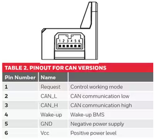 圖 3:BAS 系列傳感器的引腳布局包括電源、接地、請(qǐng)求和喚醒信號(hào),以及差分 CAN 總線信號(hào)。(圖片來(lái)源:Honeywell Sensing and Productivity)