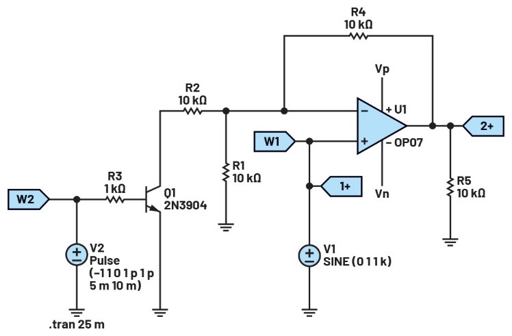 將第一個(gè)波形發(fā)生器用作VIN源,向電路提供幅度為2 V峰峰值的1 kHz正弦波激勵(lì)。使用第二個(gè)波形發(fā)生器控制晶體管,提供幅度為2 V的1 Hz方波激勵(lì)。向運(yùn)算放大器提供±5 V電源電壓。配置示波器,使通道1上顯示輸入信號(hào),通道2上顯示輸出信號(hào)。參見圖3。