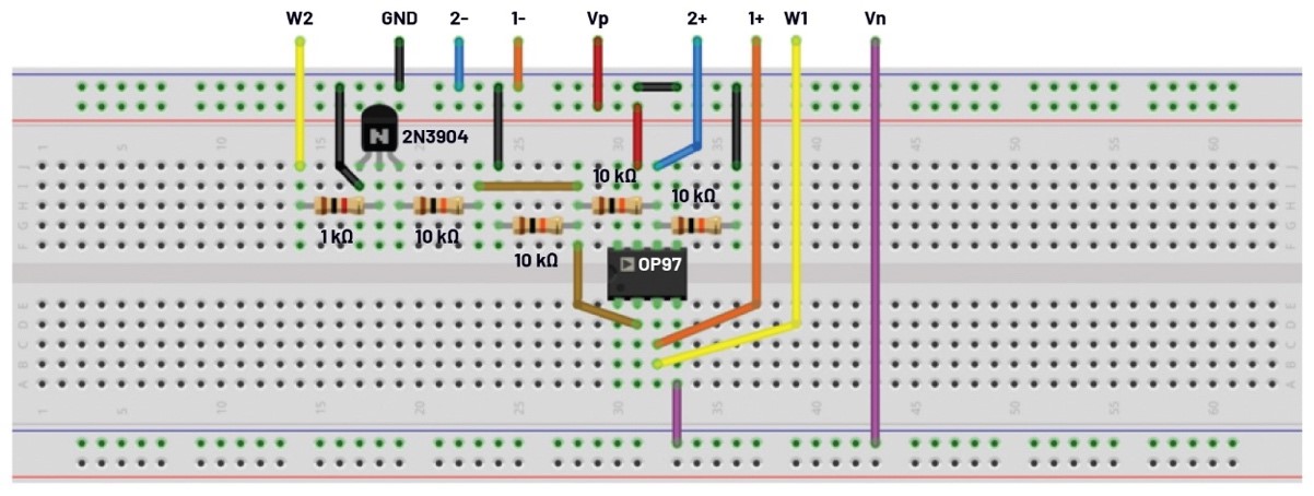 為使用晶體管的壓控放大器構(gòu)建以下試驗(yàn)板電路(圖2)。