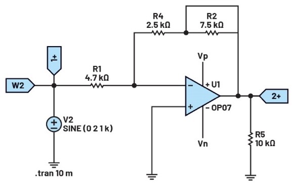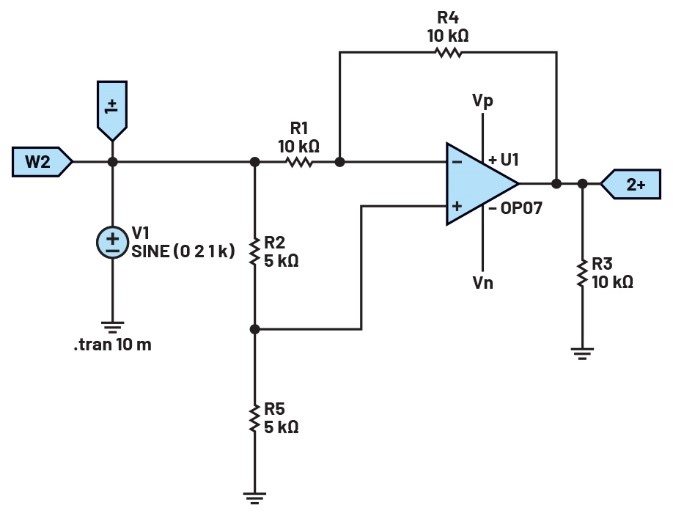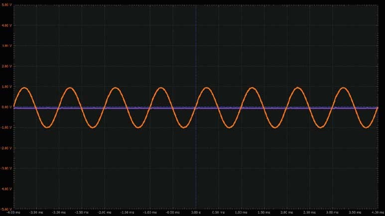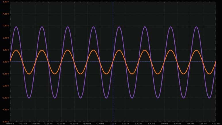 將第一個(gè)波形發(fā)生器用作VIN源,向電路提供幅度為2 V峰峰值的1 kHz正弦波激勵(lì)。向運(yùn)算放大器提供±5 V電源電壓。配置示波器,使通道1上顯示輸入信號(hào),通道2上顯示輸出信號(hào)。參見圖9。