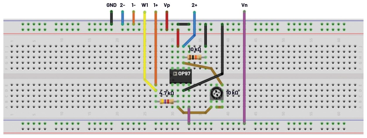 圖8.使用電位計(jì)的可變?cè)鲆娣聪?同相放大器的試驗(yàn)板電路