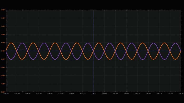 將第一個(gè)波形發(fā)生器用作VIN源,向電路提供幅度為2 V峰峰值的1 kHz正弦波激勵(lì)。向運(yùn)算放大器提供±5 V電源電壓。配置示波器,使通道1上顯示輸入信號(hào),通道2上顯示輸出信號(hào)。參見圖6。