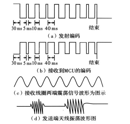 本系統(tǒng)的閱讀器可在6cm范圍內(nèi)識別應答器的有無,若有應答器在監(jiān)測范圍內(nèi),則給出明確的指示并讀取應答器預設的4位編碼,然后顯示;另外,應答器部分還可以通過開關設置4位編碼在閱讀器識別范圍內(nèi)送出編碼信號。同時閱讀器還具有對應答器的編碼進行寫入的功能,由應答器接收并儲存。設計中重點是保證正確率,可以從軟件上增加校驗碼來提高無線傳輸?shù)目煽柯省?/p>
