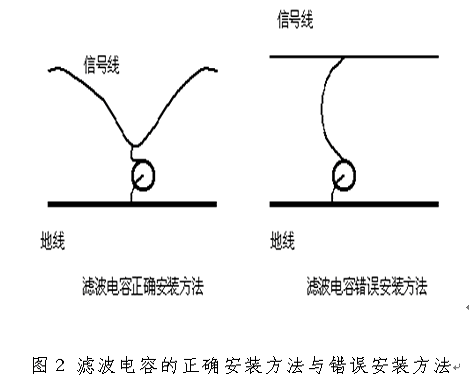 電容的諧振頻率由ESL和C共同決定,電容值或電感值越大,則諧振頻率越低,也就是電容的高頻濾波效果越差。ESL除了與電容器的種類有關(guān)外,電容的引線長度是一個十分重要的參數(shù),引線越長,則電感越大,電容的諧振頻率越低。因此在實(shí)際工程中,要使電容器的引線盡量短,電容器的正確安裝方法和不正確安裝方法如圖2所示。