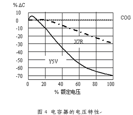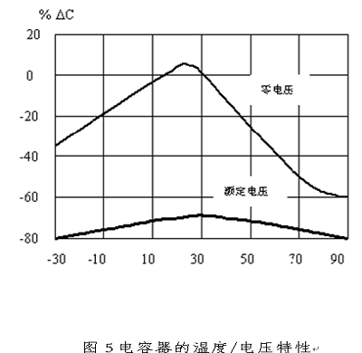 從圖中可以看到,COG電容器的容量幾乎隨溫度沒有變化,X7R電容器的容量在額定工作溫度范圍變化12%以下,Y5V電容器的容量在額定工作溫度范圍內(nèi)變化70%以上。這些特性是必須注意的,否則會出現(xiàn)濾波器在高溫或低溫時性能變化而導(dǎo)致設(shè)備產(chǎn)生電磁兼容問題。