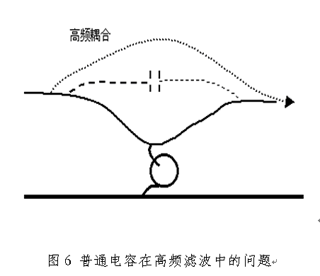 在實(shí)際工程中,要濾除的電磁噪聲頻率往往高達(dá)數(shù)百M(fèi)Hz,甚至超過1GHz。對這樣高頻的電磁噪聲必須使用穿心電容才能有效地濾除。普通電容之所以不能有效地濾除高頻噪聲,是因?yàn)閮蓚€原因,一個原因是電容引線電感造成電容諧振,對高頻信號呈現(xiàn)較大的阻抗,削弱了對高頻信號的旁路作用;另一個原因是導(dǎo)線之間的寄生電容使高頻信號發(fā)生耦合,降低了濾波效果,如圖5所示。