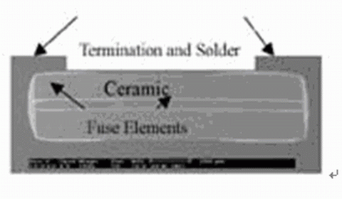 ---AEM SolidMatrix SMD熔斷器與常規(guī)片式熔斷器在結(jié)構(gòu)方面具有顯著的不同:它是疊層多元陶瓷獨(dú)石結(jié)構(gòu)。所謂多元就是指它具有分離的多層熔斷單元。熔斷單元之間用有很好滅弧作用的陶瓷材料隔開。熔斷單元位于陶瓷結(jié)構(gòu)的中部,夾在較厚的陶瓷層中間(見圖1)。其多層熔斷元件結(jié)構(gòu)可以大大增加熔斷元件與滅弧材料的接觸面積,使滅弧反應(yīng)的時間縮短。