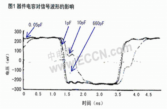 傳輸速率為12Mbps時,其保持電平的時間要長得多(80ns)。在此數(shù)據(jù)傳輸率條件下,10pF或更小的電容值將使得數(shù)據(jù)通過時的失真最小。當傳輸速率提高到480Mbps時,信號具有短得多的電平保持時間(2.0ns)。此時10pF電容的ESD抑制器件已經(jīng)引起波形失真:它減少了電平保持時間并使前沿和后沿的形狀大為改變。而660 pF電容的ESD抑制器件則造成了相當大的失真,以致于波形甚至無法達到信號工作電壓。圖1顯示了不同ESD抑制器件對480Mbps數(shù)據(jù)波形的影響。
