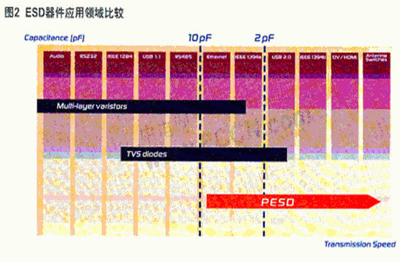 低電容ESD保護對于高速條件下保持數(shù)據(jù)的完整性是非常關(guān)鍵的。在常見的瞬間過電壓抑制器件中,金屬氧化物壓敏電阻(MOV)和多層壓敏電阻(MLV)因價廉物美而應(yīng)用廣泛。但其固有的高電容決定了其應(yīng)用范圍只能局限于低頻領(lǐng)域和電源的瞬間電壓抑制上。而硅類ESD防護器件,包括齊納二極管、TVS二極管/陣列等,雖然具有保護電壓低而準確的優(yōu)點,其寄生電容依舊不可忽視,通常難以適用于高速數(shù)據(jù)通訊接口,如HDMI、IEEE1394等。