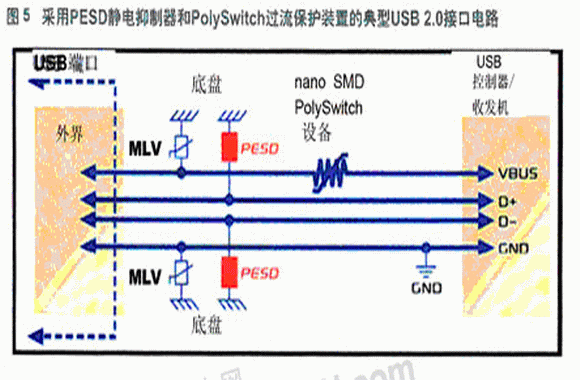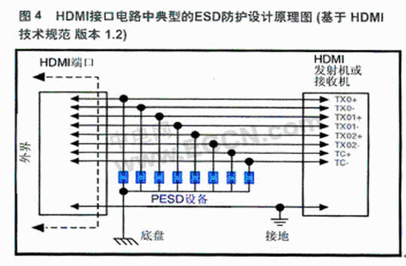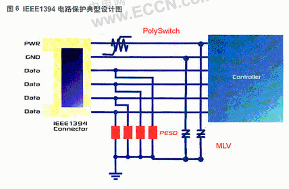 圖4、圖5和圖6展示了利用瑞侃電路保護部門PESD器件對HDMI1.3、USB2.0和IEEE1394接口電路進行保護的典型應(yīng)用。這些保護將ESD與敏感電路隔離。在傳輸線路脈沖(TLP) 測試和IEC61000-4-2測試中,尤其是經(jīng)過多次采樣(1000次TLP測試)后,其性能要比其他可比較的元件好。相對于其他典型的聚合物ESD防護器件,這類PESD器件的較低觸發(fā)電壓(通常150V)和低箝位電壓(通常25V)能更好的幫助保護敏感電子元件。該器件采用電子工業(yè)中最流行的0603和0402貼裝形式,符合RoHS的嚴格要求;幫助機頂盒敏感電路、手提電腦、手機和其它便攜式設(shè)備免ESD侵害。