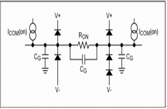 模擬開關(guān)內(nèi)的通道元件通常包括一個(gè)或更多的MOSFET,同時(shí)還包含有寄生鉗位二極管(鉗位至電源電壓),用于ESD保護(hù)。圖1顯示了一個(gè)閉合的模擬開關(guān)的等效電路圖。只要V+和V-存在,并且輸入電壓不超過(guò):電源電壓 + 鉗位二極管的正向偏壓(典型0.6V),二極管就處于反向偏置,沒(méi)有電流通過(guò)。
