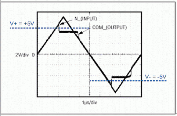 圖6顯示了一個(gè)閉合的、具有故障保護(hù)的開關(guān)在經(jīng)歷兩個(gè)方向的輸入故障電壓期間的輸出情況。通常情況下,在輸入電壓比V+ (或V-)高出150mV約200ns后,輸出(COM)就會(huì)等于正(或負(fù))電源電壓減去一個(gè)FET的電壓降。當(dāng)輸入電壓返回到電源范圍以內(nèi)后,需要再經(jīng)過(guò)一個(gè)700ns (典型值)的延遲,輸出方可恢復(fù)并跟隨輸入。這個(gè)延遲和COM輸出端的電阻和電容有關(guān),而和故障電壓的幅度無(wú)關(guān)。COM端的電阻和電容越大,恢復(fù)時(shí)間就越長(zhǎng)。
