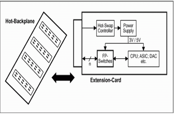 除了一些典型應(yīng)用以外,例如在ATE和工業(yè)設(shè)備中作為模擬輸入的保護(hù),這些低電壓、故障保護(hù)型開關(guān)還可以在很多其他應(yīng)用中用來(lái)簡(jiǎn)化設(shè)計(jì)和解決板上空間不足的問(wèn)題。舉例來(lái)講,為了避免切斷整個(gè)設(shè)備機(jī)箱的電源,許多應(yīng)用要求能夠向一個(gè)帶電的底板插入擴(kuò)展卡。盡管可以用MAX4271這樣的熱插拔控制器來(lái)限制卡上的浪涌電流,但其信號(hào)線的保護(hù)并不容易。當(dāng)你將板卡插入底板時(shí),底板的數(shù)據(jù)總線采用5V TTL電平進(jìn)行通信,這時(shí)卡上的數(shù)字IC (微控制器,ASIC等)就有可能在5V電源接通前在其輸入端“看到”5V電壓。前面已經(jīng)提到,這種情況會(huì)導(dǎo)致鎖定或板卡損壞。
