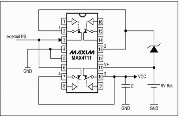 VCC由第10引腳的開關(guān)取出,大多數(shù)應(yīng)用中,這個(gè)電壓還要由后面的電壓調(diào)節(jié)器進(jìn)行調(diào)理。一旦檢測(cè)到外部電源電壓,微控制器接通開關(guān)1和4,斷開開關(guān)3。輸出電容C在VCC由開關(guān)3切向開關(guān)4的過(guò)程中為系統(tǒng)提供電源。為了保護(hù)電池,當(dāng)開關(guān)4閉合時(shí),必須始終保持開關(guān)3處于斷開狀態(tài)。外部電源移走后,開關(guān)4和1斷開而開關(guān)3閉合。當(dāng)外部電源電壓高于電池電壓,或電池已深度放電時(shí)接入外部電源,或C已充電而電池被移走時(shí),故障保護(hù)特性可以保證開關(guān)正確、安全地工作。