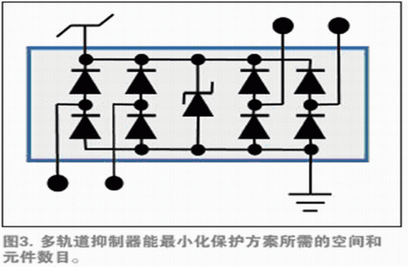 如果產(chǎn)品要在輸入/輸出線中承受某些額外阻抗(如在單端邏輯輸入時(shí)經(jīng)常出現(xiàn)的情況),可以通過在外部夾鉗和IC引腳之間增加一個(gè)電阻器,使外部和芯片上二極管之間的電流有助于外部防護(hù)(圖2b)。一些TVS二極管供應(yīng)商在單一小型組件包里提供兩個(gè)結(jié)型二極管和一個(gè)TVS夾鉗,進(jìn)一步減少組件數(shù)目、降低裝配成本,避免互連偏離。這些組件包同樣適用于多軌道情況——單一的組件包為幾條普通供電軌提供保護(hù)(圖3)。