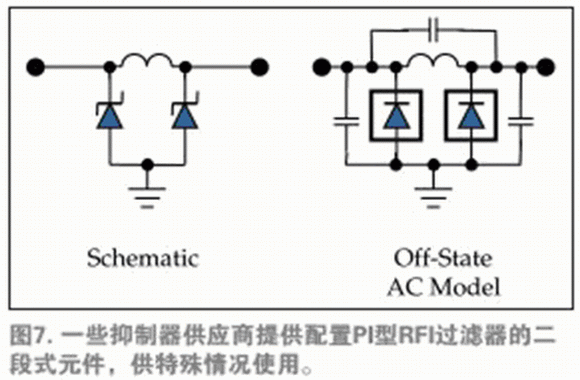 類似圖1b中的片上二段夾鉗結(jié)構(gòu)也應(yīng)用于外部夾鉗,在相同設(shè)備中同時(shí)實(shí)現(xiàn)瞬態(tài)超電壓防護(hù)和電磁干擾(EMI)過濾。這種布局是基本的π形網(wǎng)絡(luò),同時(shí),TVS二極管的寄生電容有利于完成EMI過濾。電阻和感應(yīng)網(wǎng)絡(luò)均可直接利用,滿足各種實(shí)體電路層對(duì)于信令的具體要求(圖7)。抑制器供應(yīng)商通常按照通信標(biāo)準(zhǔn)在選擇器向?qū)е袑?duì)元件加以區(qū)分,確保適當(dāng)?shù)膸捄湍承┨匦宰杩沟膽?yīng)用。